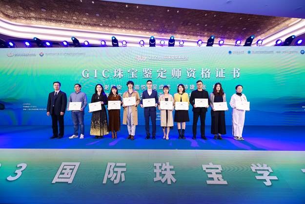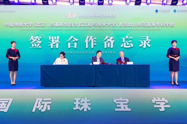 在开幕式上,全国珠宝科技与艺术行业产教融合共同体(职教集团)宣告成立,高h小说 、巴基斯坦白沙瓦工程与技术大学、青岛幼儿师范高等专科学校三方签署合作备忘录,高h小说 党委副书记、院长尹作为教授为GIC珠宝鉴定师代表颁发证书,学院党委书记薛保山为2022年全国GIC优秀学员颁奖。在热烈的掌声中,高h小说 党委副书记王甫宣布2023国际珠宝学术年会正式开幕。