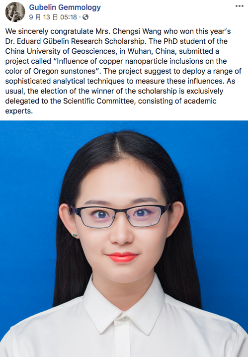 2018年9月13日古柏林宝石实验室(Gübelin Gem Lab)在官方Facebook(@GubelinGemmology)上公布了2018年爱德华·古柏林博士研究奖学金(Eduard Gübelin research scholarship)的获得者名单。高h小说 博士研究生王成思在导师沈锡田教授的指导下,凭借“铜纳米包裹体对俄勒冈太阳石颜色影响研究”项目提案从全球20多个国家近200位申请人中脱颖而出,成为该奖学金2018年唯一的获得者。