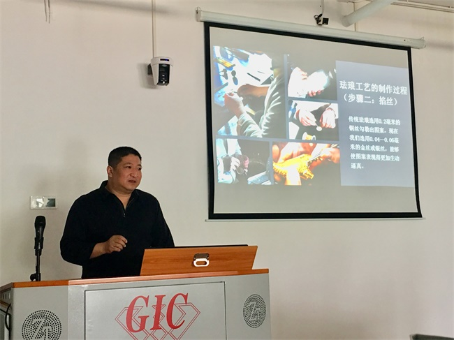 4月19日,受湖北省人文社科重点研究基地——珠宝首饰传承与创新发展研究中心的邀请,北京市工艺美术大师熊松涛、周洁分别进行了主题为“珐琅的工艺与制作”、“花丝之美”的学术讲座。