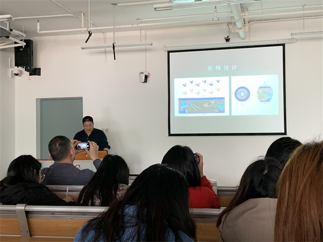 “珐琅的工艺与制作”讲座先是从珐琅工艺在中国的传承发展介绍了珐琅工艺传入中国的历程,与中外珐琅发展的对比两方面进行讲解,让我们了解到珐琅工艺与中国古典传统审美进行结合,在短时间内迅速发展并具有了中式特色。之后熊老师从不同珐琅工艺的类别进行详尽的介绍,从材质、特点、创作流程等方面为同学们讲解其特色与差异、具有的不同肌理效果。
