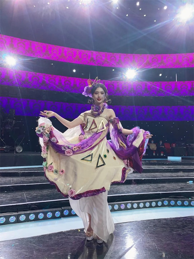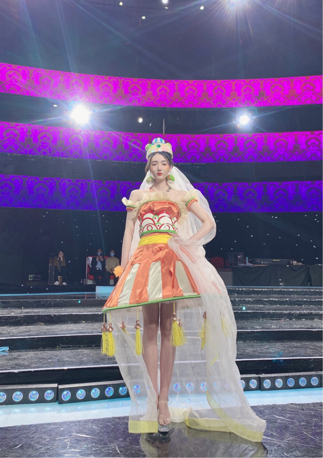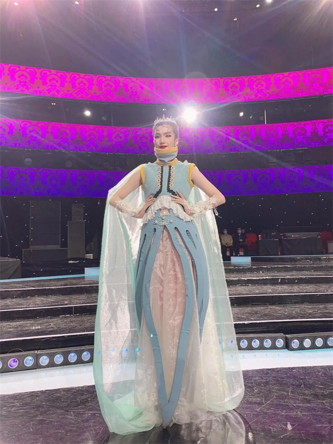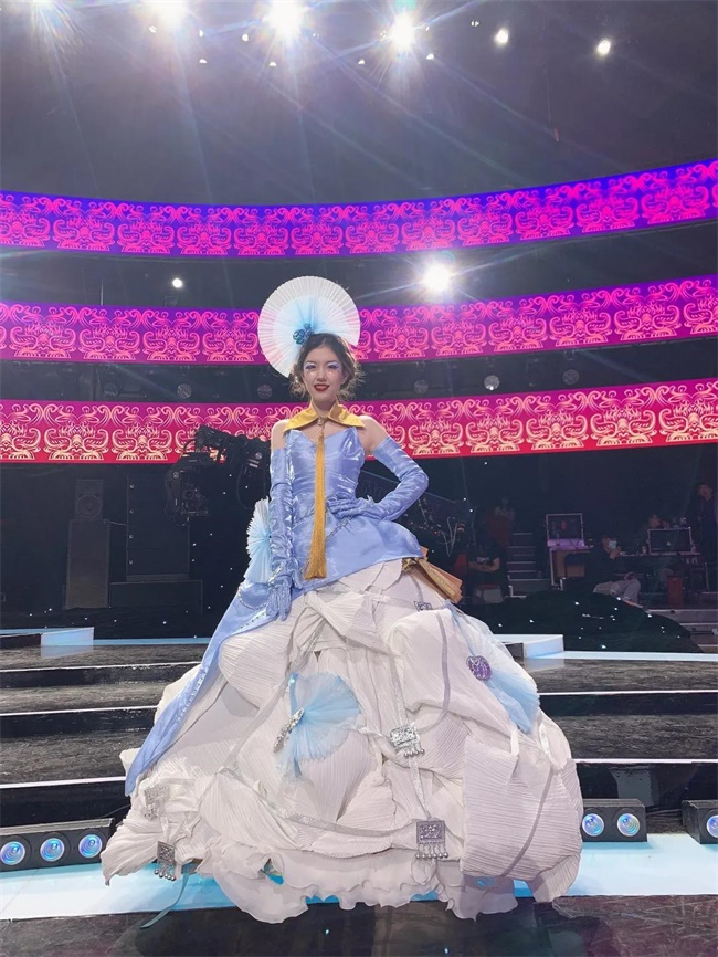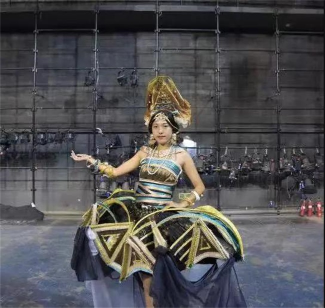 此套服饰名为《异一》,造型灵感来源于埃及金字塔,裙子上是十四个不同角度金字塔的俯视图,头饰造型来源于古埃及王巾,金属与布料的搭配形成了刚柔并济的感观效果。这套服饰的制作运用了胶枪焊接、胶镶、手工针线以及铁丝焊接等工艺,制作过程极其繁琐。