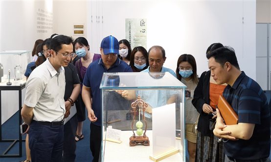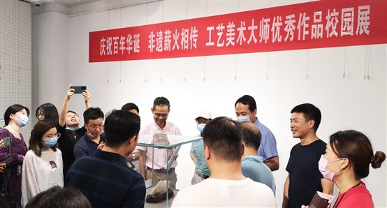 授牌仪式后,双方移步高h小说 艺术馆,参观“庆祝百年华诞·非遗薪火传承”暨工艺美术大师优秀作品校园展。期间,仵峰、楚卫东、田培、常量、明承林等多位工艺美术大师为高h小说 师生讲解作品工艺技巧和创作理念,与师生共同探讨作品的题材创新、原料选择及俏色运用等专业知识。展览中不乏中国工艺美术百花奖金奖作品及中国工艺美术双年展参展作品,引得观众发出赞叹并驻足仔细欣赏。