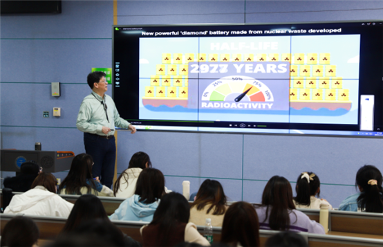 这是一堂生动的教学示范课。沈教授从钻石的宝石学特征及性质到钻石中的固态CO2包裹体特点、钻石中的变色龙效应、磷光现象做了详细的讲解,并就近期科研团队研究的成果与老师和同学们做了分享。