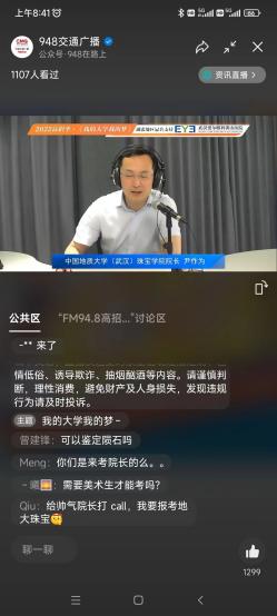 节目同时通过中国交通广播FM94.8、中央广播电视总台官方音频客户端“云听”、微信订阅号“948在路上”、视频号“948交通广播”进行直播,上千人聆听收看了节目,并与尹作为教授进行了积极地互动交流。