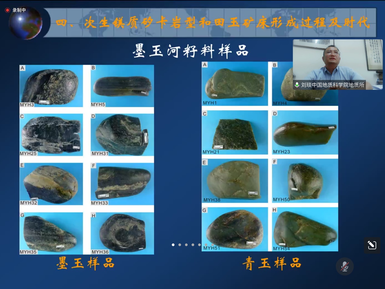 刘琰研究员近十年来一直从事碳酸盐型稀土矿床的研究工作和镁质矽卡岩矿床(含和田玉)研究,此次学术报告重点讲述《中国矿产地质和田玉矿卷》的研究成果,涉及原生/次生镁质矽卡岩型和田玉矿床形成过程及时代,和田软玉山料矿床成因及年龄。根据西昆仑的区域地质特征、接触交代变质、矿物共生组合和岩相学特征认为和田镁质矽卡岩原生和次生矿床是接触交代变质为主的镁质矽卡岩矿床,总结出全国各主要和田玉矿床的成矿规律,划分了成矿带,明确了主要和田玉矿床的成矿时代和颜色成因。同时也分享了韩国春川软玉的矿物组成与结构特征,春川软玉的锆石U-Pb年龄及同位素特征,分析韩国软玉的成因和形成时代约束。