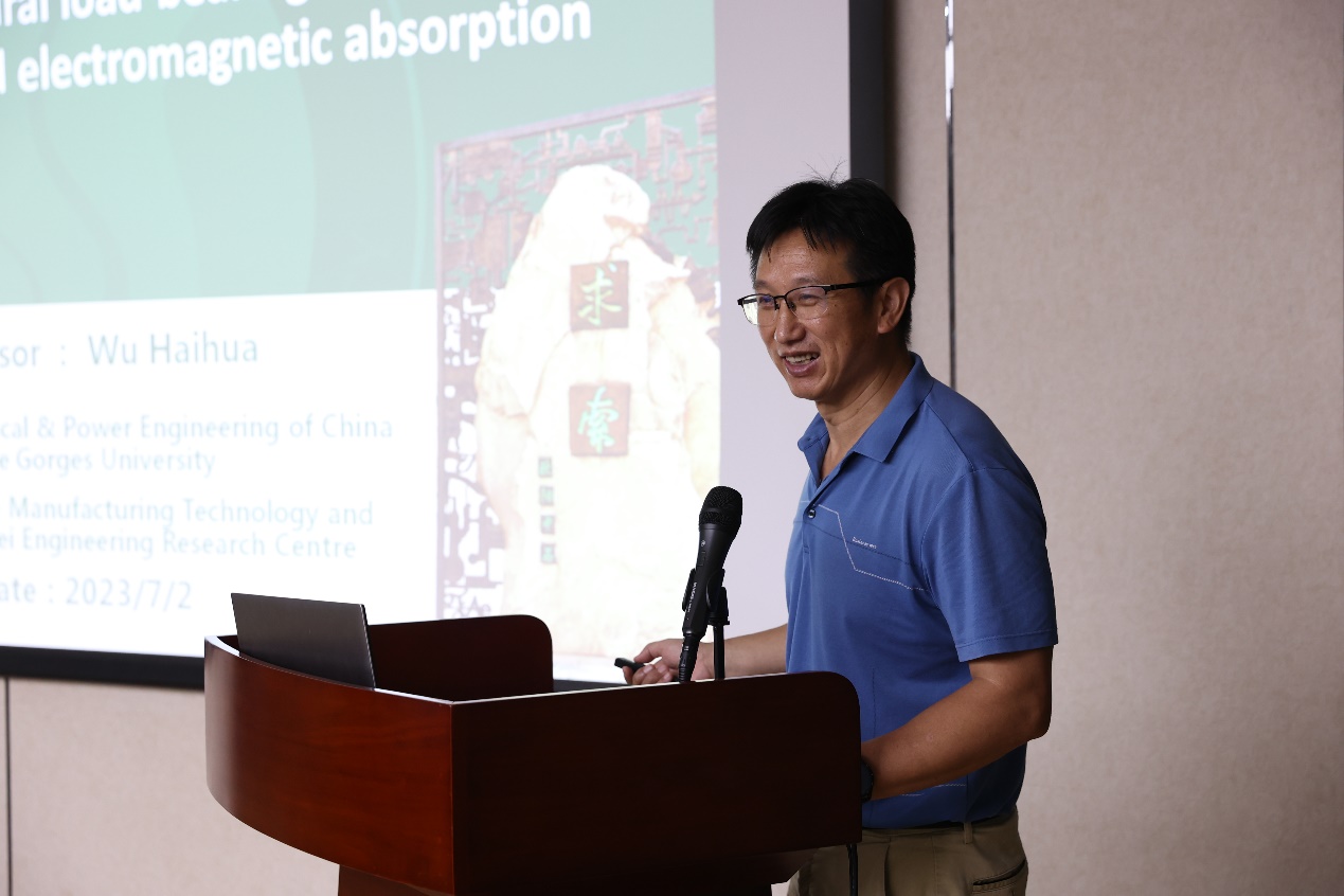 第三场报告由湖北三峡大学吴海华教授围绕“Porous NFG/SiCnw Composites Fabricated by SLS for Structural Load-bearing and Functional Integrated Electromagnetic Absorption”进行展开。吴海华教授团队以热固性酚醛树脂为粘结剂,采用选择性激光烧结3D打印技术和高温烧结工艺制备了具有多孔结构的NFG/SiCnw吸波材料,阐明了NFG/SiCnw复合材料中电磁波的协同衰减机理,指出将SLS 3D打印技术与高温烧结工艺相结合制备的复合材料在工业电磁吸收中具有巨大的实际应用潜力。