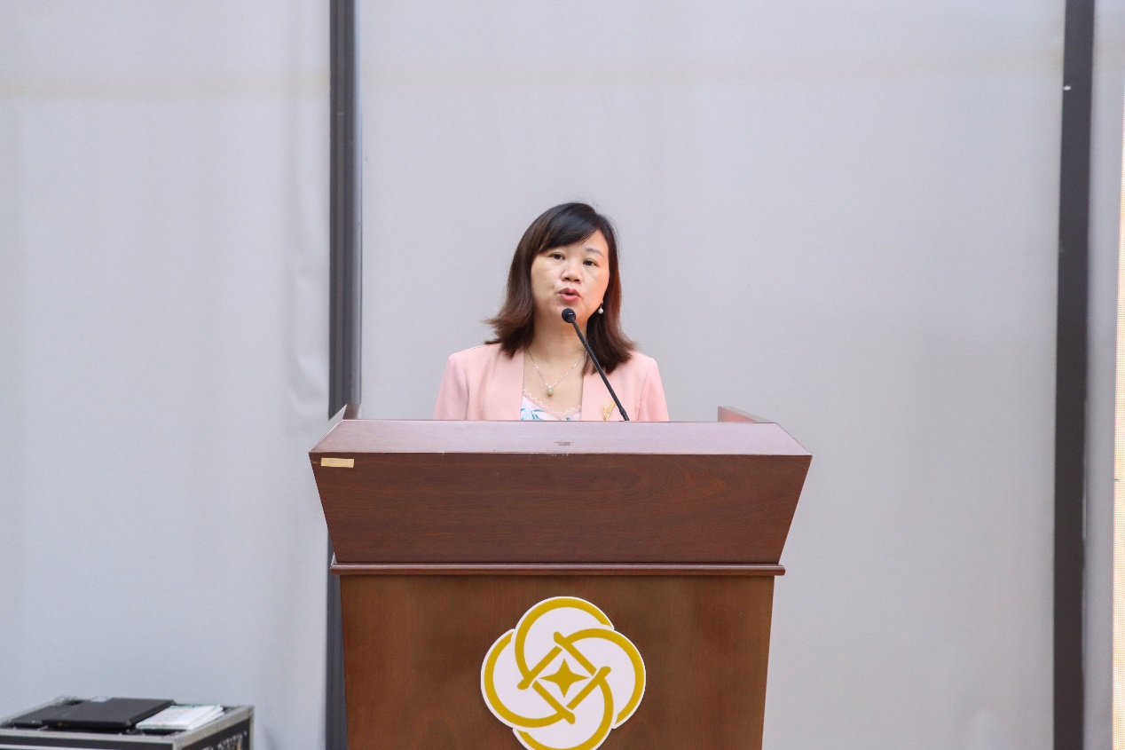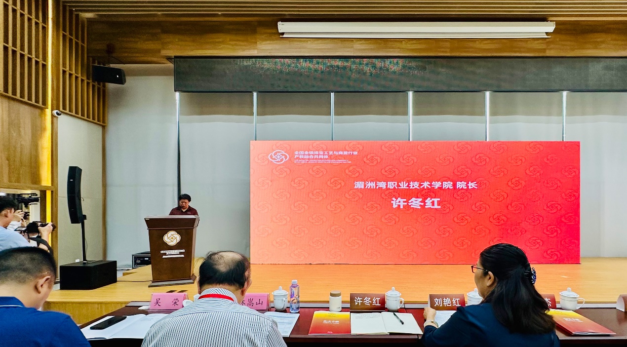 湄洲湾职业技术学院院长许冬红女士讲话。她表达了对共同体成立的坚定支持,并对产教融合所带来的积极变化充满信心和期待。许院长表示,湄洲湾职业技术学院将继续发挥自身优势,与共同体成员单位携手并进,共同推动金银珠宝工艺与商贸行业的高质量发展。