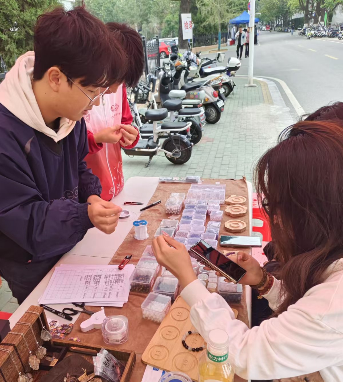 串珠体验活动上更是广受来访者的好评,参与者们能够根据自己的喜欢原创设计搭配样式,创造属于自己独一无二的手串。志协新人王欣蕊说“在爱心串珠活动中,我与来访者可以近距离沟通交流,运用课堂上学习的珠宝知识,让自己对珠宝有了更深刻的理解。”