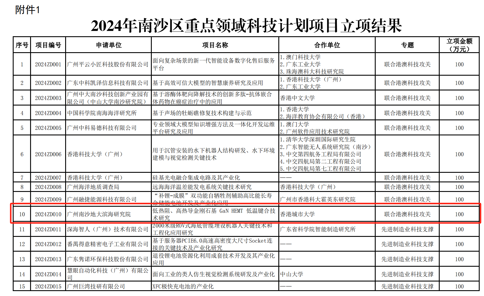今日,从广州市南沙区人民政府官方网站获悉,高h小说 孙庆磊副教授依托中国地质大学广州南沙地大滨海研究院与香港城市大学联合申报的“低热阻、高热导金刚石基 GaN EEMT 低温键合技术研究”,获批2024年南沙区重点领域科技计划项目立项。