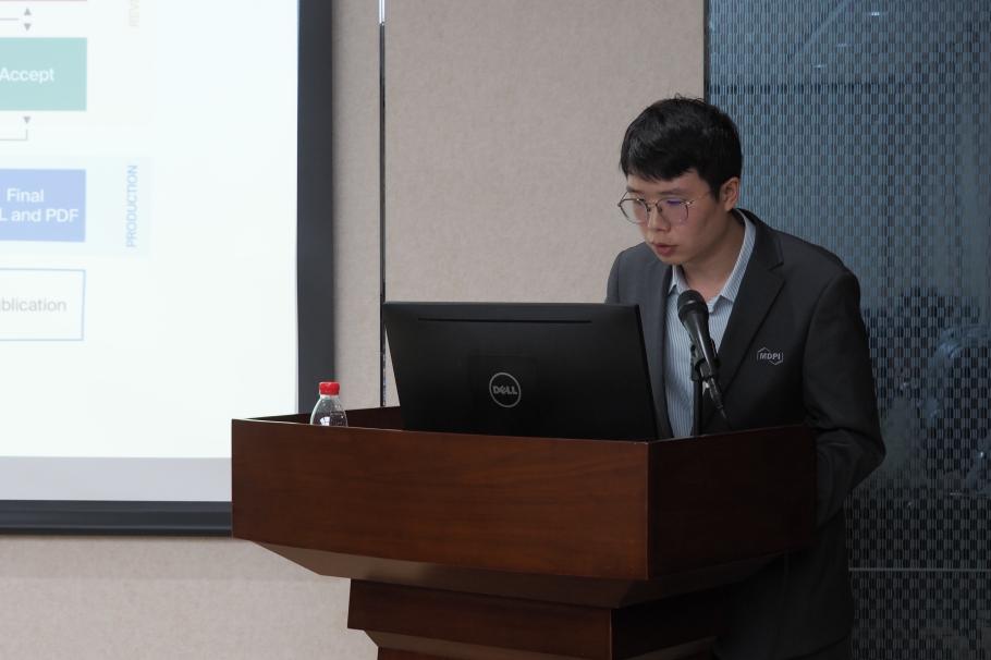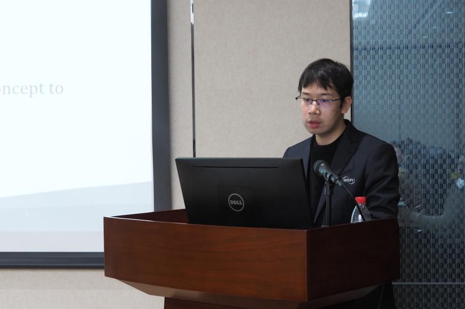 会议第一项议程是由 MDPI 出版专员钟奕博士主讲的英文科技论文写作指南。钟博士以投稿信的格式与内容为切入点,随后系统讲解了从标题、摘要、关键词、绪论、正文到结论等研究论文各部分的撰写要点及注意事项。他的讲解条理清晰、实例丰富,使同学们对论文投稿与撰写流程有了全面而具体的认识,不仅构建了清晰的认知框架,也为今后独立开展科技论文创作奠定了扎实的理论与实践基础。