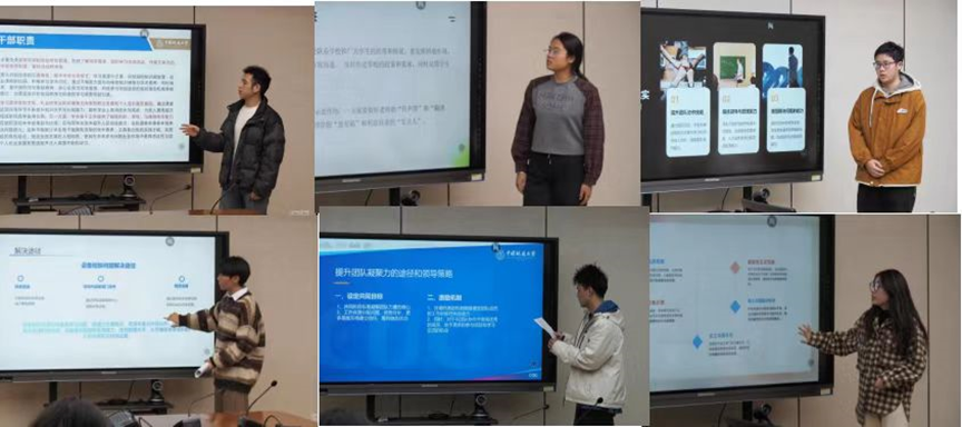 培训班的小组进行小组汇报,在陈玉冰的组织下,首先一组代表邓玉坤以“学生骨干如何平衡工作与学习”为主题进行结构化研讨报告,以干部职责、问题现状、影响因素、管理办法四个方面为点深入探讨,重点论述了当代转变对大学生传统评价方式、注重综合发展与评价的重要性。