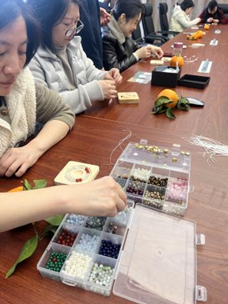 随后,活动进入手工制作体验环节。在讲师和助教的指导下,老师们亲手挑选搭配串珠并动手制作属于自己的串珠作品。无论是娇艳欲滴的粉水晶,还是清新脱俗的海蓝宝,每一件作品都凝聚了她们的创意与心意。