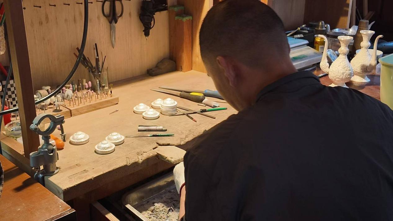 看到有同学锤打时手腕发颤,他接过锤头示范,锤头仿佛长在手上,轻触银料发出清脆的 “嗒嗒” 声,原本歪扭的银片慢慢舒展开来。休息时,他通过动作示意,自己打了几十年银,每天都在与银料对话,银料会因不当处理而变形,用心对待才能让它焕发光彩。