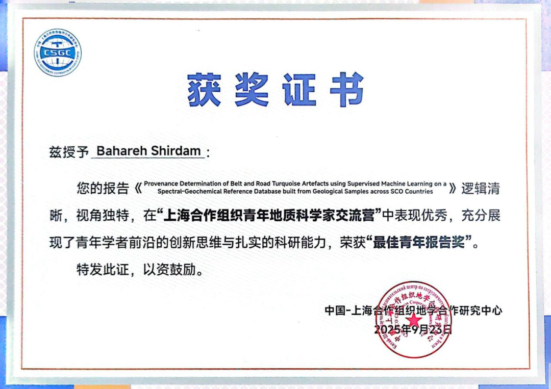 “上合组织青年地质科学家交流营” 是上合组织框架下推动地学领域国际交流与合作的重要平台,旨在为上合组织成员国的青年地质科学家搭建学术交流、经验分享与合作共赢的桥梁,助力青年地质人才成长,促进各国在地质资源勘探、地质灾害防治、生态环境保护等领域的协同发展。此次交流营吸引了来自俄罗斯、哈萨克斯坦、伊朗、巴基斯坦等多个上合组织成员国的顶尖高校和科研机构的青年学者参与,竞争异常激烈。能够在这样高水平的国际交流活动中斩获重要奖项充分体现了 BAHAREH SHIRDAM 在地质学和宝石学研究领域的深厚功底和突出潜力。她的研究不仅在地球科学领域具有创新性和研究意义,更为一带一路文化交流的历史溯源工作提供了重要的科学依据。