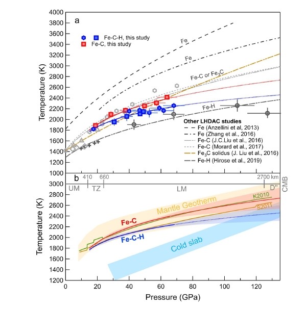 实验进一步研究了高温高压下Fe-C与Fe-C-H体系的熔融行为,发现Fe-C-H体系的共晶熔点(Eutectic melting point)低于Fe-C体系,说明H的加入降低了Fe-C体系的熔点。通过对比地幔温度发现,Fe-C-H体系的共晶熔点低于或者非常接近地幔温度,而Fe-C的共晶熔点则处于前人地幔温度模型的温度范围中间,并接近或高于最新的地幔模型温度(图1)。因此,如果在俯冲带和地幔间的氧化还原反应中形成的铁合金为Fe-C化合物,其可能会氧化还原“冻结”在地幔中;如果因H的加入形成Fe-C-H合金,则可能发生熔融。因此,C和H的共同深部循环可能在地幔中中形成Fe-C-H熔体,并同时加强C和H两种挥发分在地幔中的流动性。