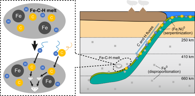 如果金刚石是在岩石圈里形成我们称其为岩石圈金刚石,绝大多数开采的金刚石都是岩石圈金刚石,还有少量的金刚石来自于岩石圈以下,我们称其为超深金刚石,许多宝石级大颗粒的库里南型钻石(Cullinan-like diamonds)都属于超深金刚石。超深金刚石的形成与俯冲带及深部碳循环紧密相关。由于H在金刚石包裹体研究中常是一种“隐形”的元素(H很难被探测,且在退回常温常压后会从Fe中分离出来),因此其在金刚石形成中的作用可能在之前的研究中被极大地忽视了。通常,在Fe-C二元体系中,C含量要超过Fe7C3中的C含量才能析出金刚石,然而许多金刚石中的Fe合金包裹体C含量远小于析出金刚石所需的含量。我们的研究显示高温下H可以“挤”出铁碳合金中的C形成金刚石,帮助金刚石在更低C含量的Fe熔体中形成;同时,H的加入使得Fe熔体的熔点降低,从而在地幔中,特别是在板块俯冲到670 km发生停滞时,产生更多熔体环境帮助金刚石生长。这两方面的作用还会在 C, H通过俯冲作用不断补充的过程中得到加强,进一步促进超深金刚石的析出及生长(图2)。