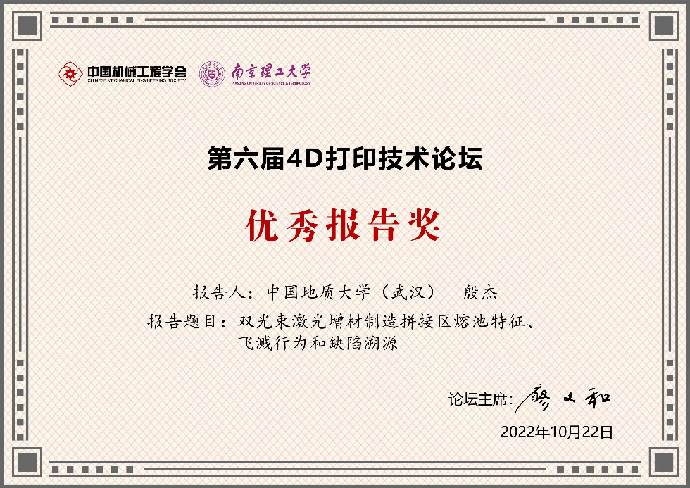 近日,高h小说 殷杰教授所作题为《双光束激光增材制造拼接区熔池特征、飞溅行为和缺陷溯源》报告获得第六届4D打印技术论坛“优秀报告奖”。