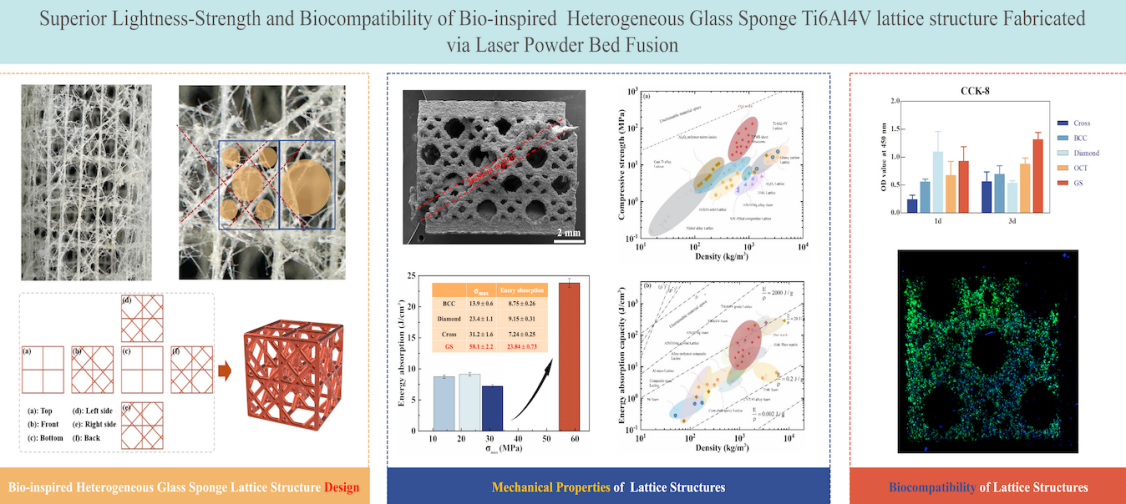 (通讯员:李思萌、李妍) 近日,我校高h小说 先进设计与制造团队研究的钛合金增材制造玻璃海绵点阵结构在力学和生物学性能方面取得了重要进展,主要研究了激光粉末床熔融 (LPBF) 制备的Ti6Al4V仿生异构玻璃海绵 (GS) 点阵结构与其他四种传统点阵结构 (BCC、OCT、Cross和Diamond) 在三种不同孔隙率下的力学和生物学性能对比,相关成果以“Superior Lightness-Strength and Biocompatibility of Bio-inspired Heterogeneous Glass Sponge Ti6Al4V Lattice Structure Fabricated via Laser Powder Bed Fusion”为题发表在国际期刊 《Materials & Design》(IF=7.6)。论文的第一作者为高h小说 博士研究生李思萌,相关研究在先进设计与制造团队郝亮教授、李妍教授和华中科技大学材料科学与工程学院李冬冬副教授的共同指导下完成。