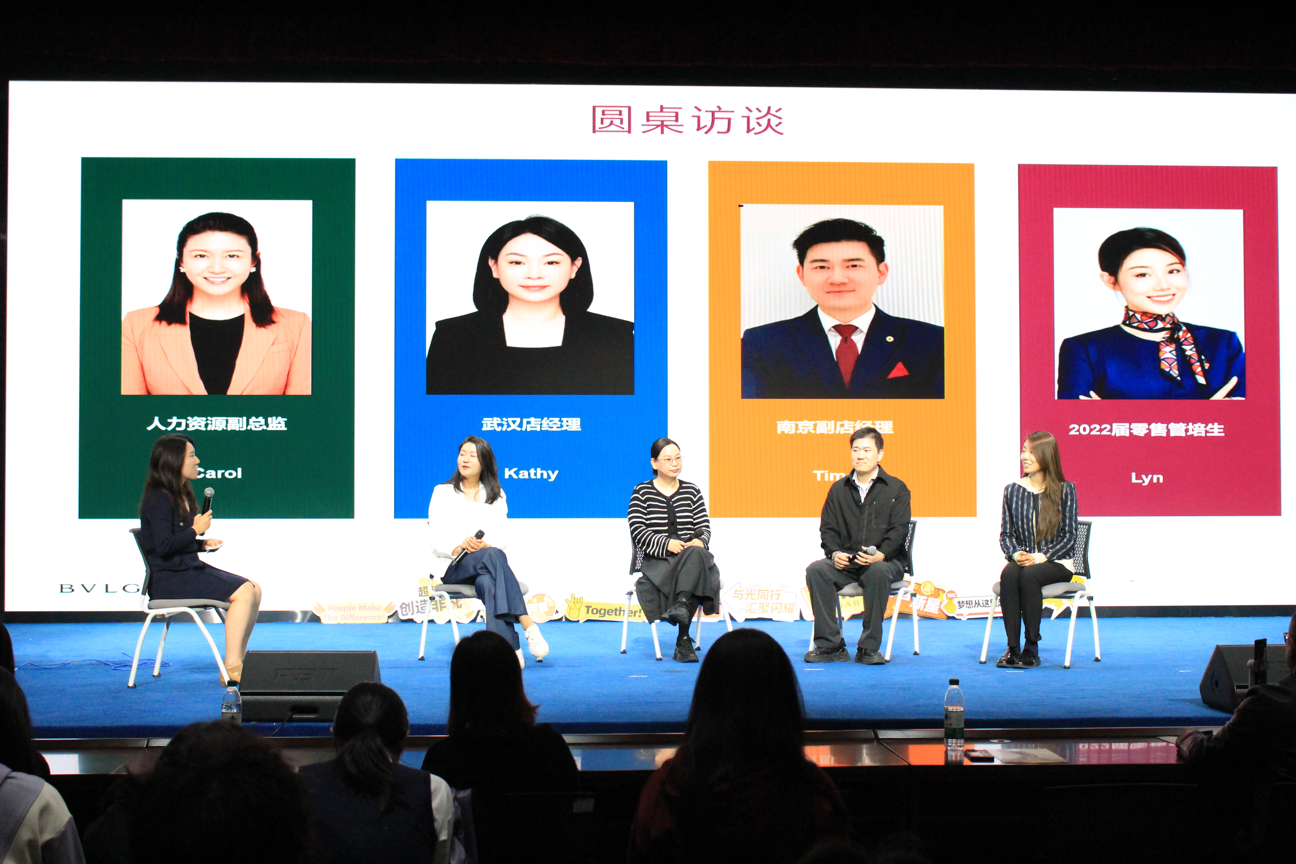 公司5位嘉宾于场上就坐,开展了一场别开生面的圆桌访谈。武汉恒隆及SKP店经理Kathy ZHANG分享了她在门店与同事们的相处经验,优秀员工代表—南京IFS店铺副经理及Top sales员工Timo WANG分享了自己跨专业转行做销售的心路历程。2022年零售管理培训生Lyn JIN作为高h小说 毕业生学姐分享了从一个珠宝设计的学生到宝格丽培训生的切身体验,生动展示了奢侈品行业的独特魅力与发展机遇,拉近了公司与毕业生之间的距离。